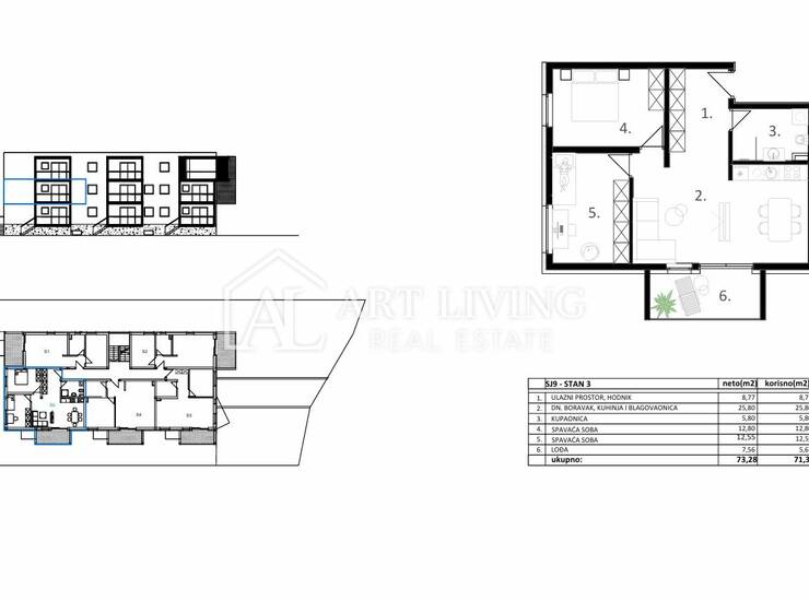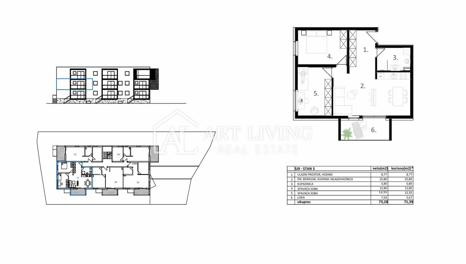 Stan SJ9, ukupne neto stambene površine 71,39 m2, smješten je na 1. katu stambeno poslovne zgrade. Sastoji se od ulaznog prostora, dnevnog boravka s kuhinjom i blagovaonicom, dvije spavaće sobe, kupaonice te loggie površine 7,56 m2