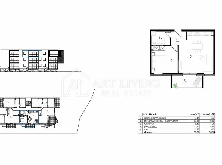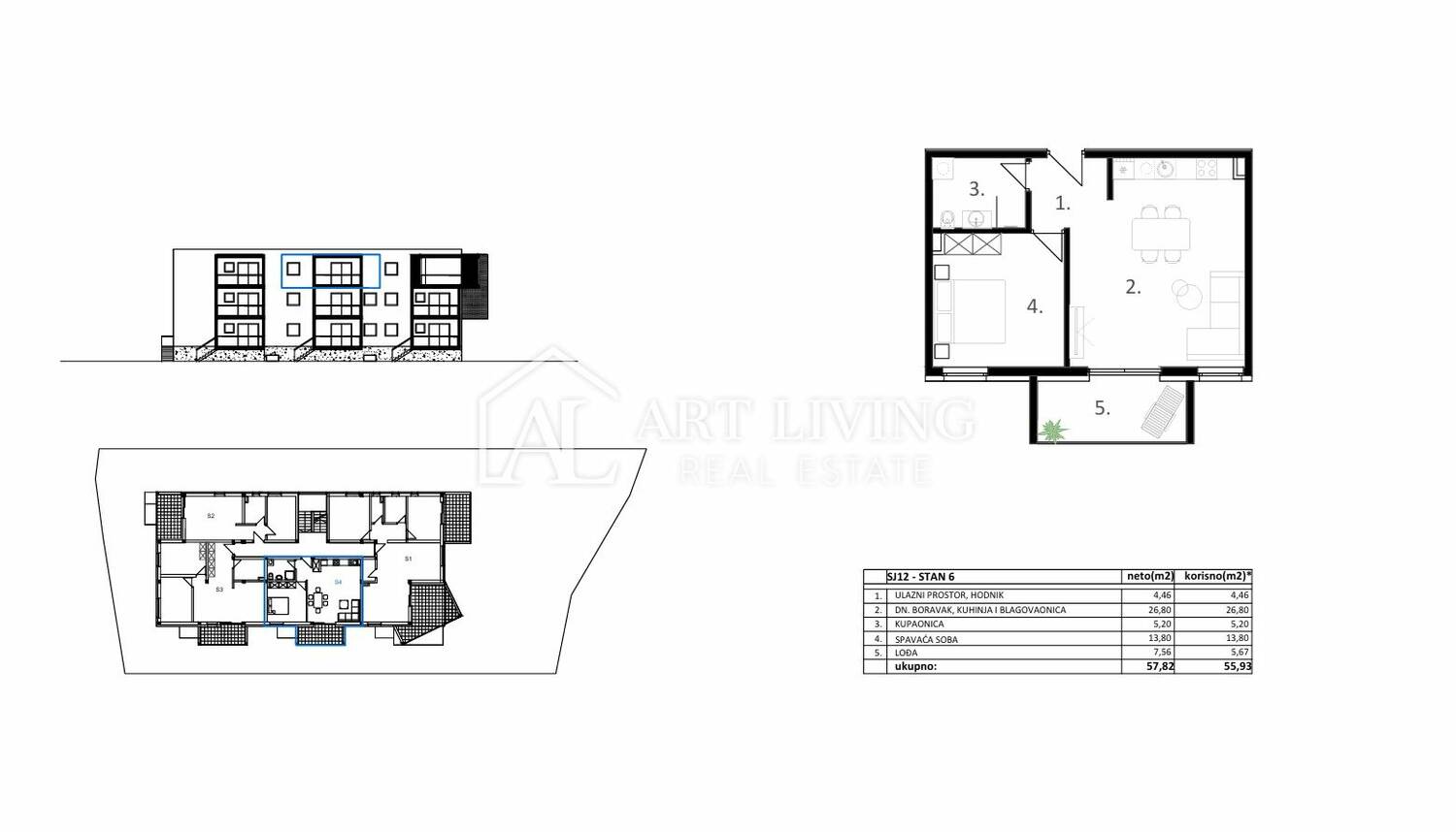 Stan SJ12, ukupne neto stambene površine 55,93 m2, smješten je na 2. katu stambeno poslovne zgrade. Sastoji se od ulaznog prostora, dnevnog boravka s kuhinjom i blagovaonicom, spavaće sobe, kupaonice i loggie površine 7,56 m2