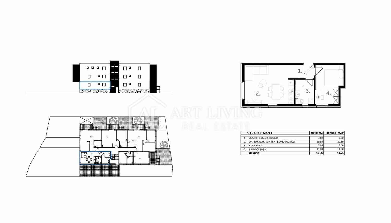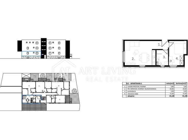 Stan SJ1, ukupne površine 41,20 m2, smješten je u prizemlju stambeno poslovne zgrade. Sastoji se od ulaznog prostora, dnevnog boravka s kuhinjom i blagovaonicom, spavaće sobe te kupaonice.