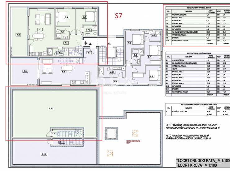 Penthouse S7 nudi prostran i funkcionalan raspored s dvije spavaće sobe, svaka s vlastitom en suite kupaonicom, dodatnom trećom kupaonicom, te prostranom dnevnom zonom otvorenog koncepta koja objedinjuje kuhinju, blagovaonicu i dnevni boravak. Iz dnevnog boravka izlazi se na natkrivenu terasu površine 21,45 m², savršenu za opuštanje i uživanje u mediteranskom ozračju. Posebnost ove nekretnine je impresivna krovna terasa površine čak 108,52 m² s koje se pruža panoramski pogled na more – idealno mjesto za privatno sunčalište, jacuzzi, ljetnu kuhinju ili druženja na otvorenom.