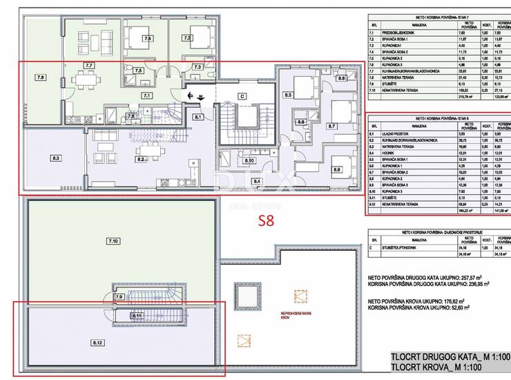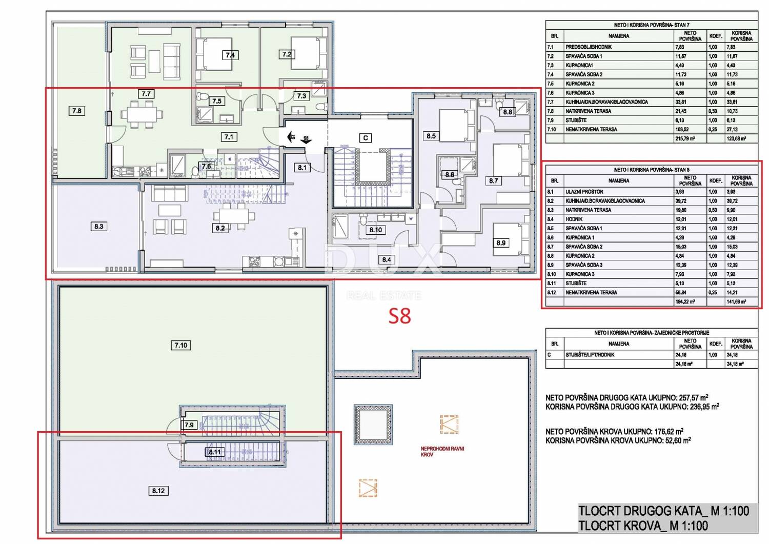 Penthouse S8 nudi prostran i funkcionalan raspored s tri spavaće sobe, od kojih dvije imaju vlastitu en suite kupaonicu, ukupno tri kupaonice, te prostranu dnevnu zonu otvorenog koncepta koja objedinjuje kuhinju, blagovaonicu i dnevni boravak. Iz dnevnog boravka izlazi se na natkrivenu terasu površine 19,80 m², savršenu za opuštanje i uživanje u mediteranskom ozračju. Posebnost ove nekretnine je prostrana krovna terasa površine 56,84 m² s koje se pruža pogled na more – idealno mjesto za privatno sunčalište, jacuzzi, ljetnu kuhinju ili druženja na otvorenom.