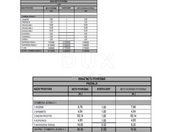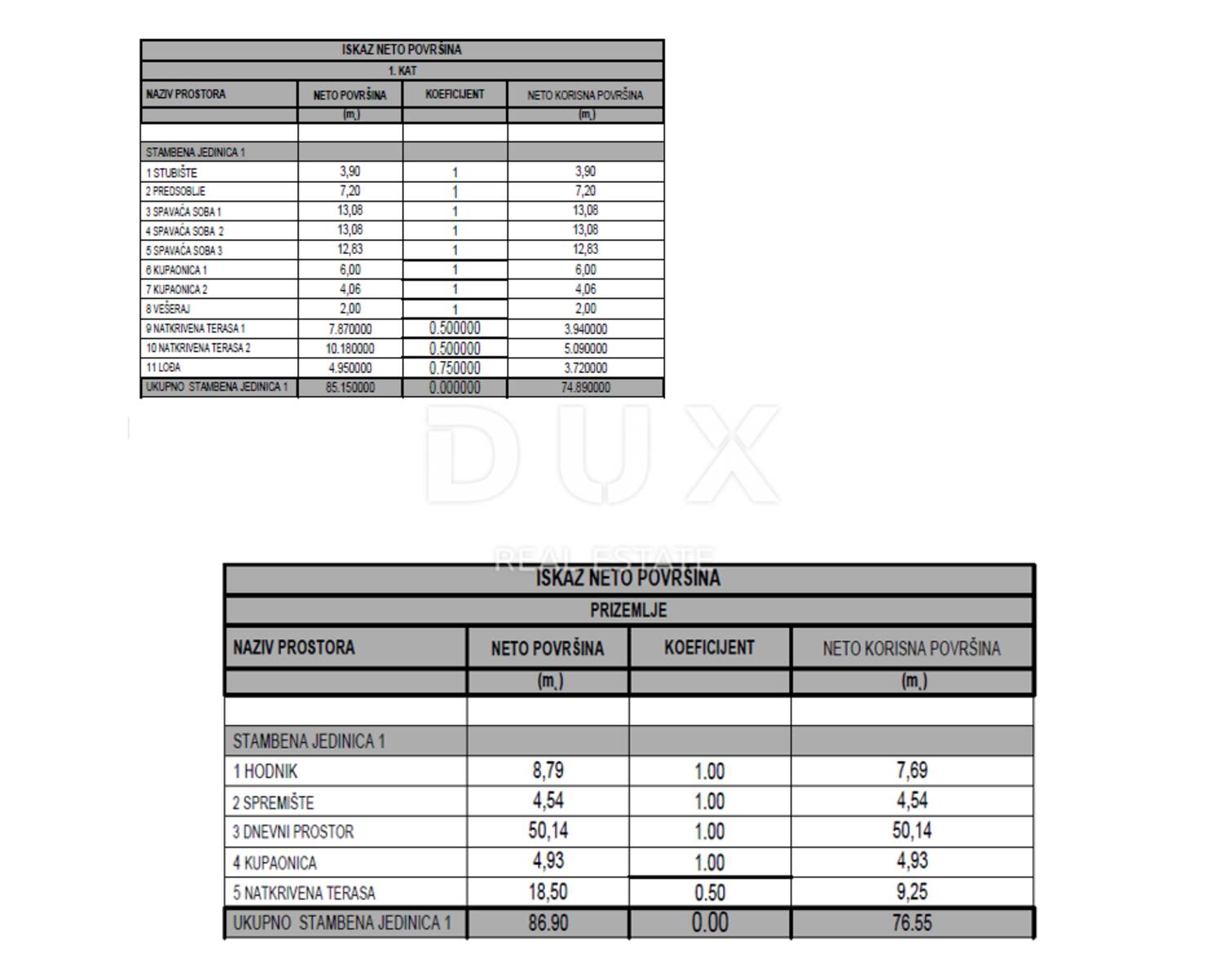 Stan se proteže kroz prizemlje i prvi kat zgrade. U prizemlju se nalazi dnevni boravak s kuhinjom i blagovaonicom te iz kojeg se izlazi na natkrivenu terasu površine 9,25 m2.