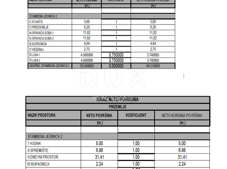 Stan se proteže kroz prizemlje i prvi kat zgrade. U prizemlju se nalazi dnevni boravak s kuhinjom i blagavonicom te iz kojeg se izlazi na lođu.