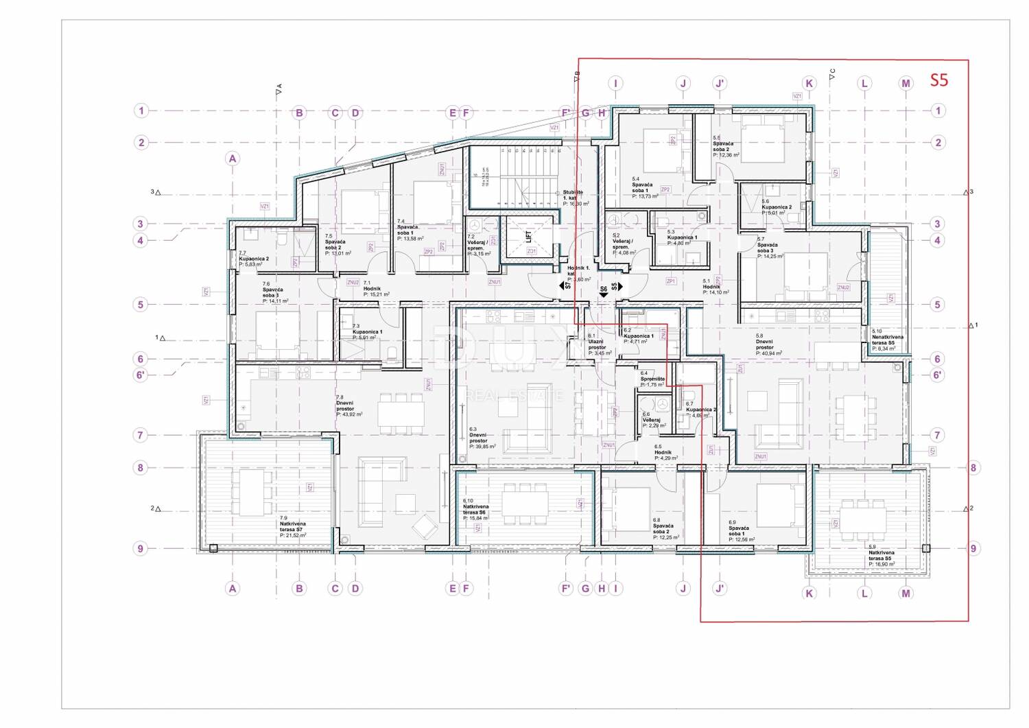Prodaje se iznimno luksuzan trosoban stan S5 na 1. katu moderne stambene zgrade vrhunske kvalitete u Vodicama kraj Šibenika. Stan ima ukupnu korisnu površinu od 135,79 m² te se ističe prostranošću, funkcionalnim rasporedom i očaravajućim pogledom na more koji se pruža iz dnevnog dijela i s terasa.