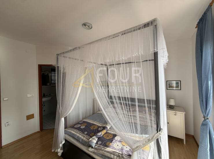 Na prvi kat dolazi se vanjskim stepenicama, gdje se nalazi stan površine 131,85 m2 koji je održavan i odmah useljiv. Sastoji se od hodnika, tri spavaće sobe (dvije s vlastitim kupaonicama i balkonima), glavne kupaonice te open space kuhinje s blagovaonicom i dnevnog boravka s izlazom na terasu.