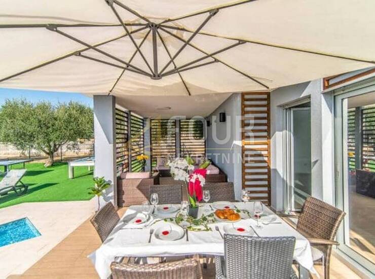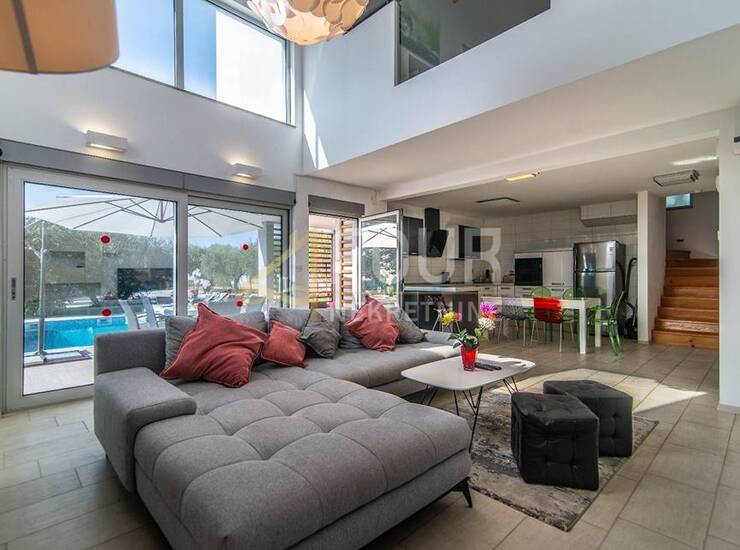 Vila je izgrađena 2015. godine i opremljena je modernim sustavima za udobnost i sigurnost – podno grijanje, dizalice topline, klimatizacija, električne rolete, protuprovalna vrata, video nadzor i alarmni sustav. U dvorištu se nalazi grijani bazen od 42 m, hortikulturno uređeni vrt s automatskim navodnjavanjem te čak sedam i više parkirnih mjesta. Dodatna vrijednost je solarna elektrana od 8,6 kW s punjačem za električne automobile.