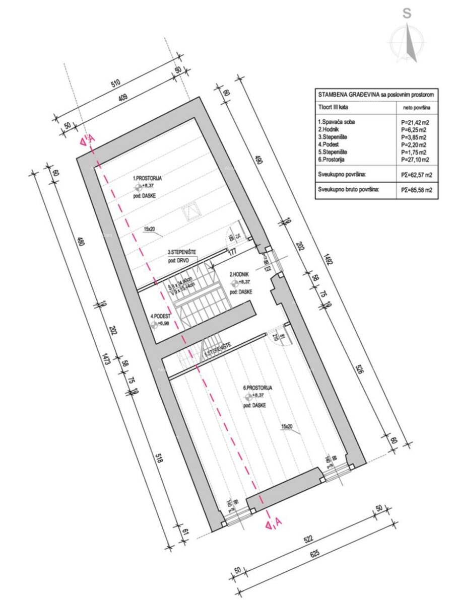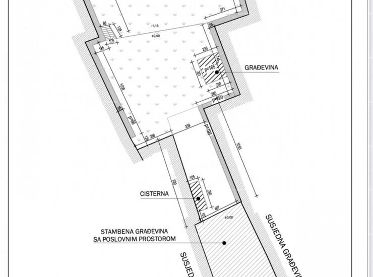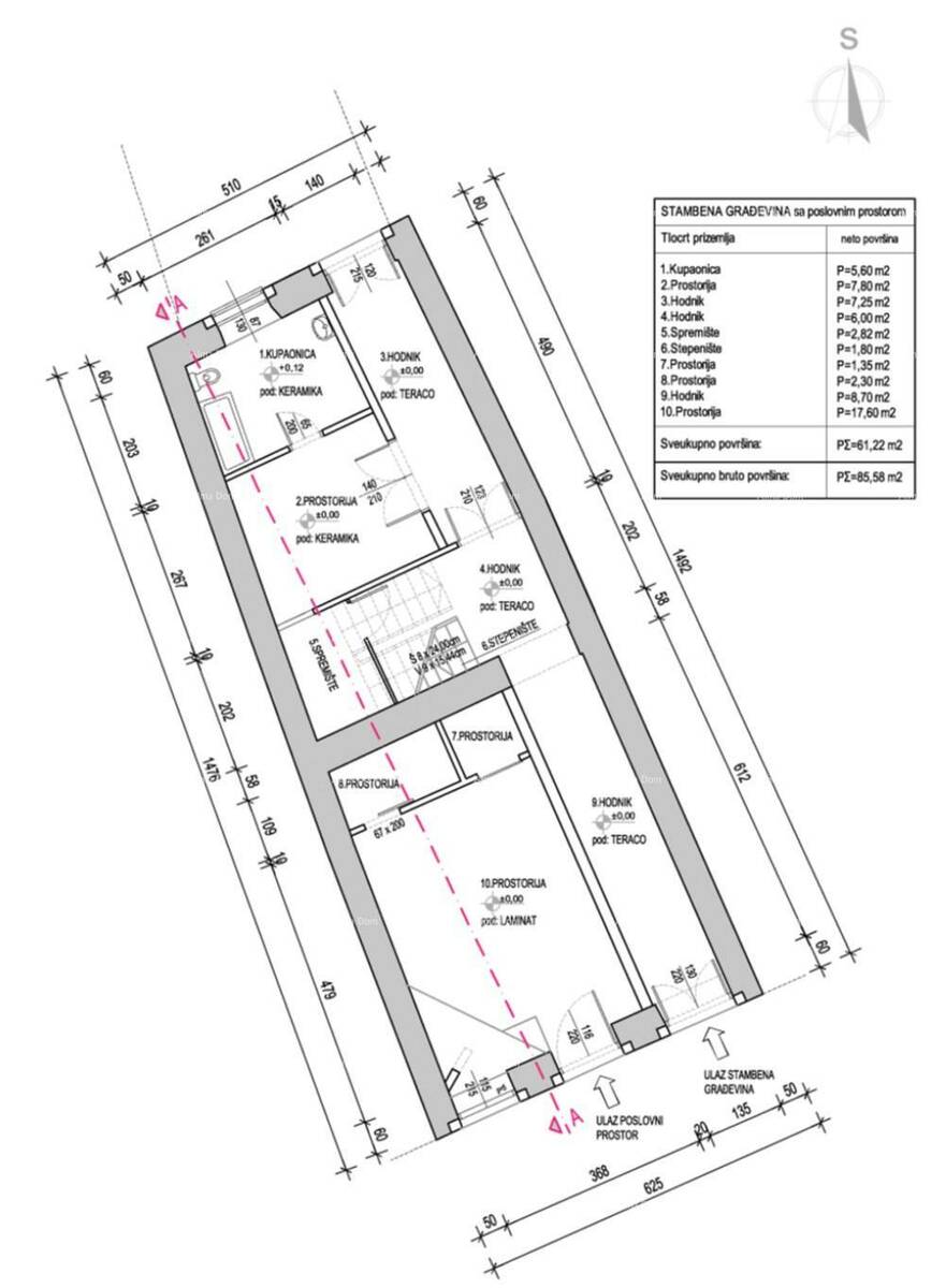 Prizemlje- Poslovni prostor koji se sastoji od četiri prostorije, tri hodnika i kupaonice. Pogodno za ured, trgovinu, ordinaciju ili drugu poslovnu djelatnost.