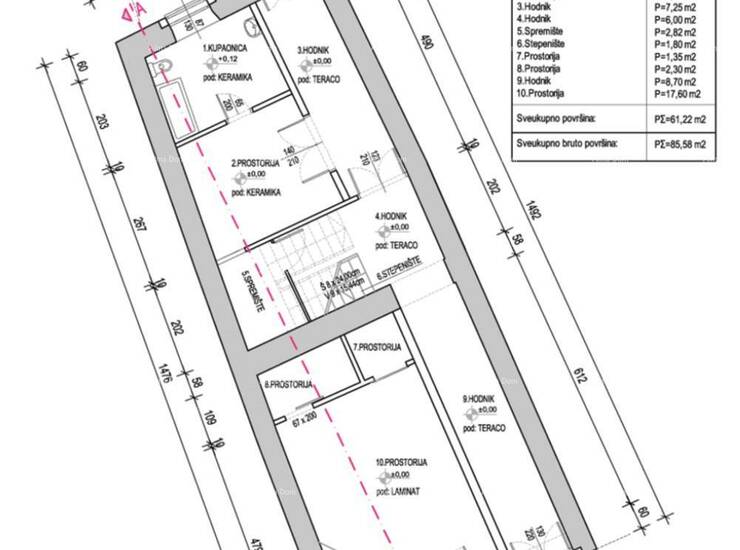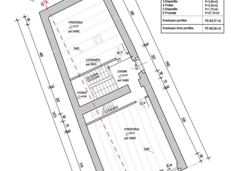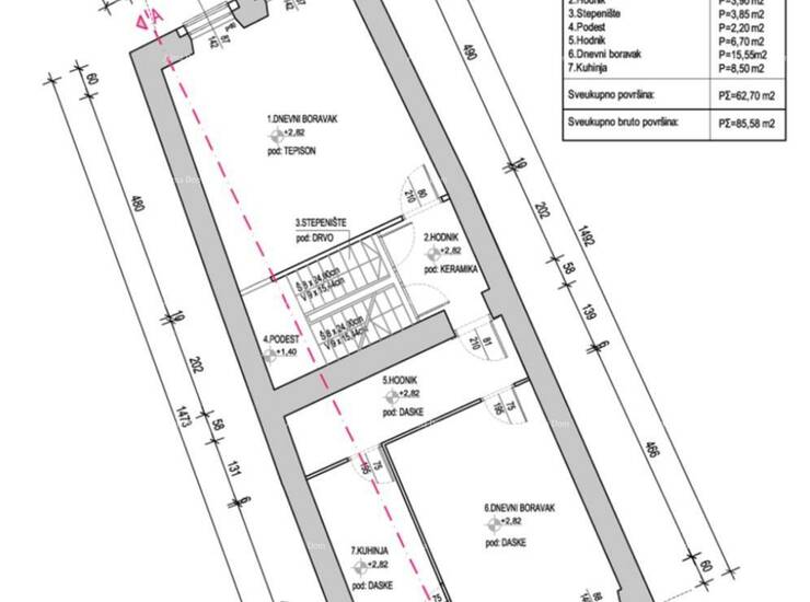 Prvi kat- sastoji se od dva dnevna boravka, kuhinje, dva hodnika i podesta.