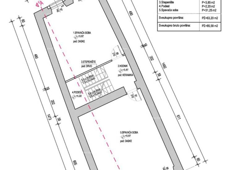 Na drugom katu nalazi se hodnik, podest i dvije spavaće sobe.