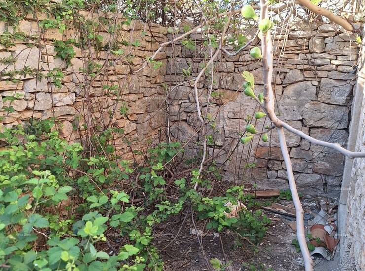 Dvorište je u potpunosti ograđeno autentičnim kamenim zidom, što pruža dodatnu privatnost i šarm, kao što je vidljivo na fotografiji.