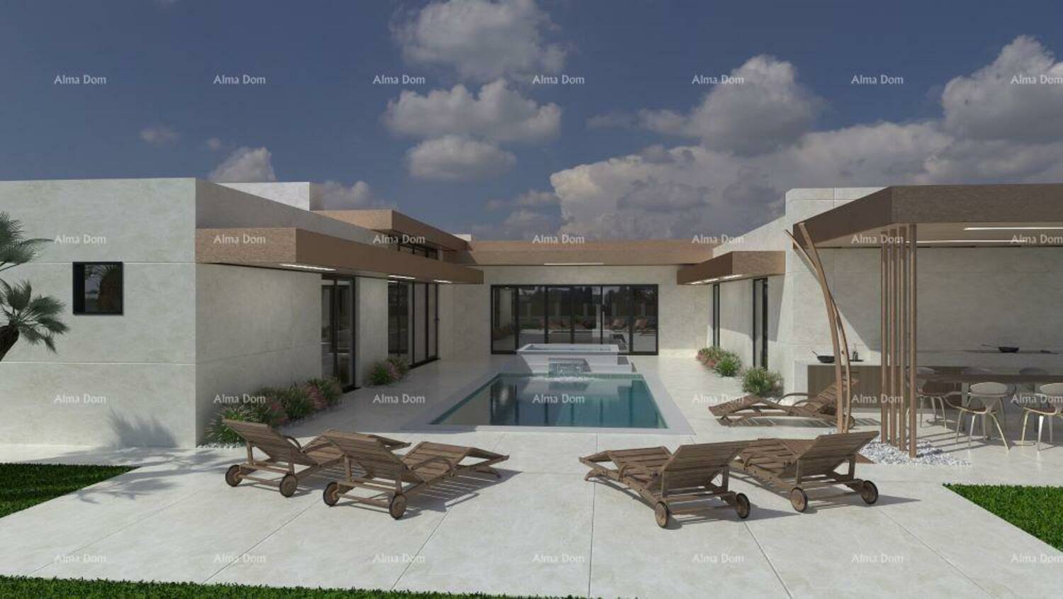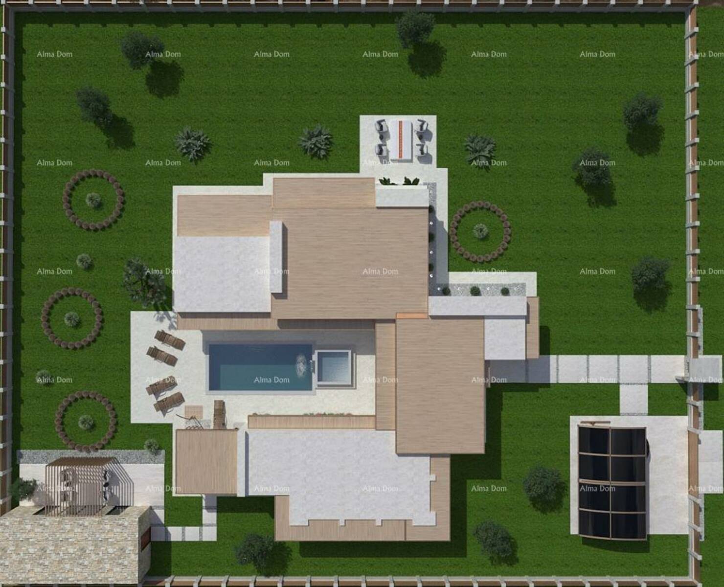 Jedna od jedinstvenosti ove prizemnice je svakako vanjski bazen sa jacuzziem. Sve prostorije u kući kao i spavaće sobe imati će pogled i izlaz na bazen koji će biti smješten u sredini objekta.