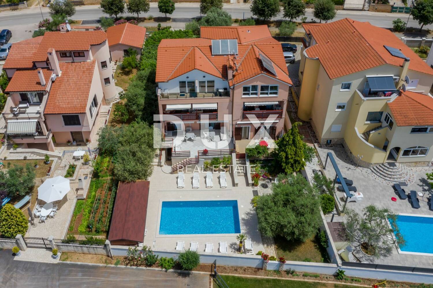 Ova prostrana kuća sastoji se od 10 apartmana, bazena, parkirališta i velike okućnice s mediteranskim vrtom.