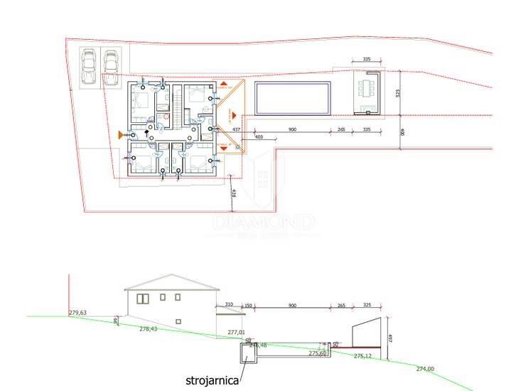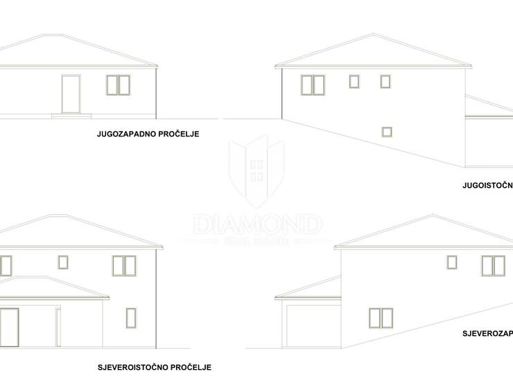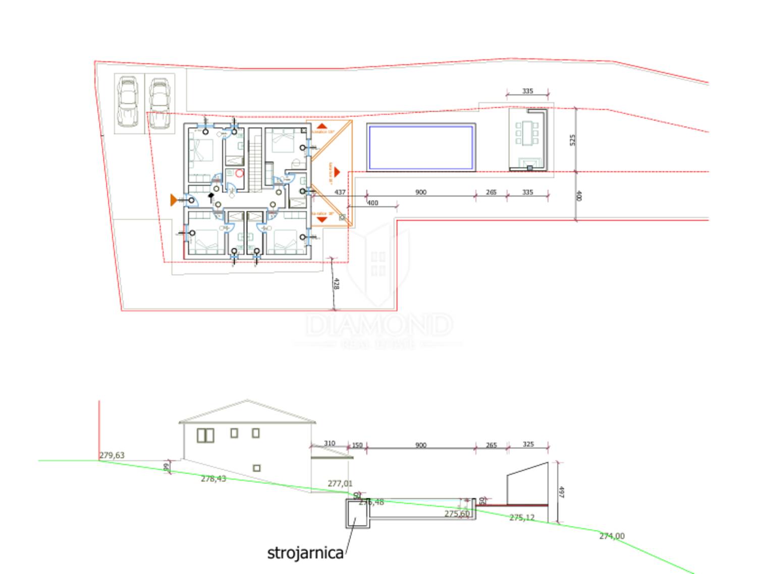 Kuća je smještena na blagoj padini i arhitektonski je osmišljena s dva odvojena ulaza. Gornji kat ima pristup izravno s parkirališta i sastoji se od četiri spavaće sobe, svaka s vlastitom kupaonicom. Unutarnje stepenice vode do prizemlja gdje se nalazi prostrana i svijetla kuhinja s blagovaonicom, dnevni boravak te glavni izlaz na terasu s predivnim pogledom na zelenilo i šumu. Ispred kuće nalazi se vanjska blagovaonica i dodatni objekt s prostorom za roštilj, barom i kutkom za druženje uz bazen površine 36 m².