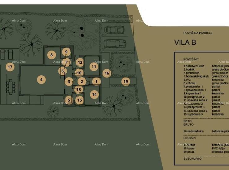 Vila B, smještena na parceli od 801.20 m2, je prizemnica bruto površine 187,27 m2.