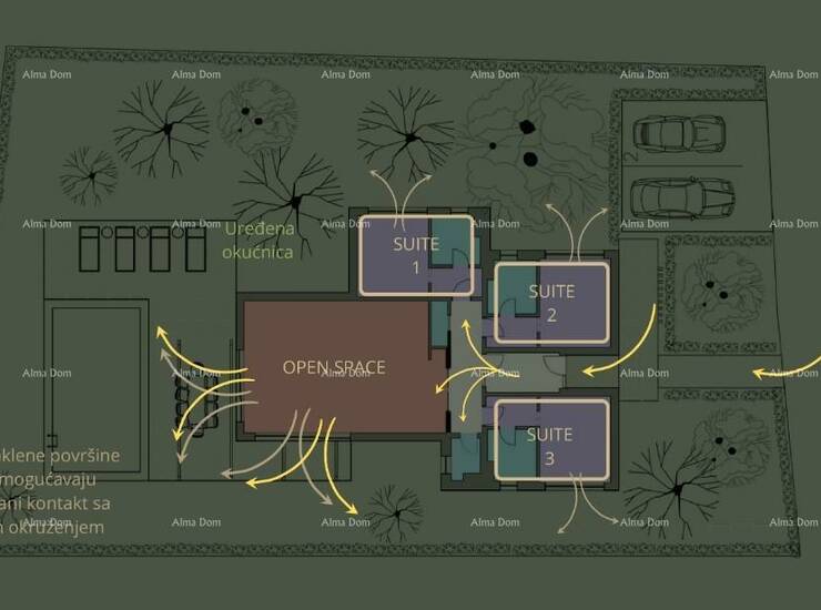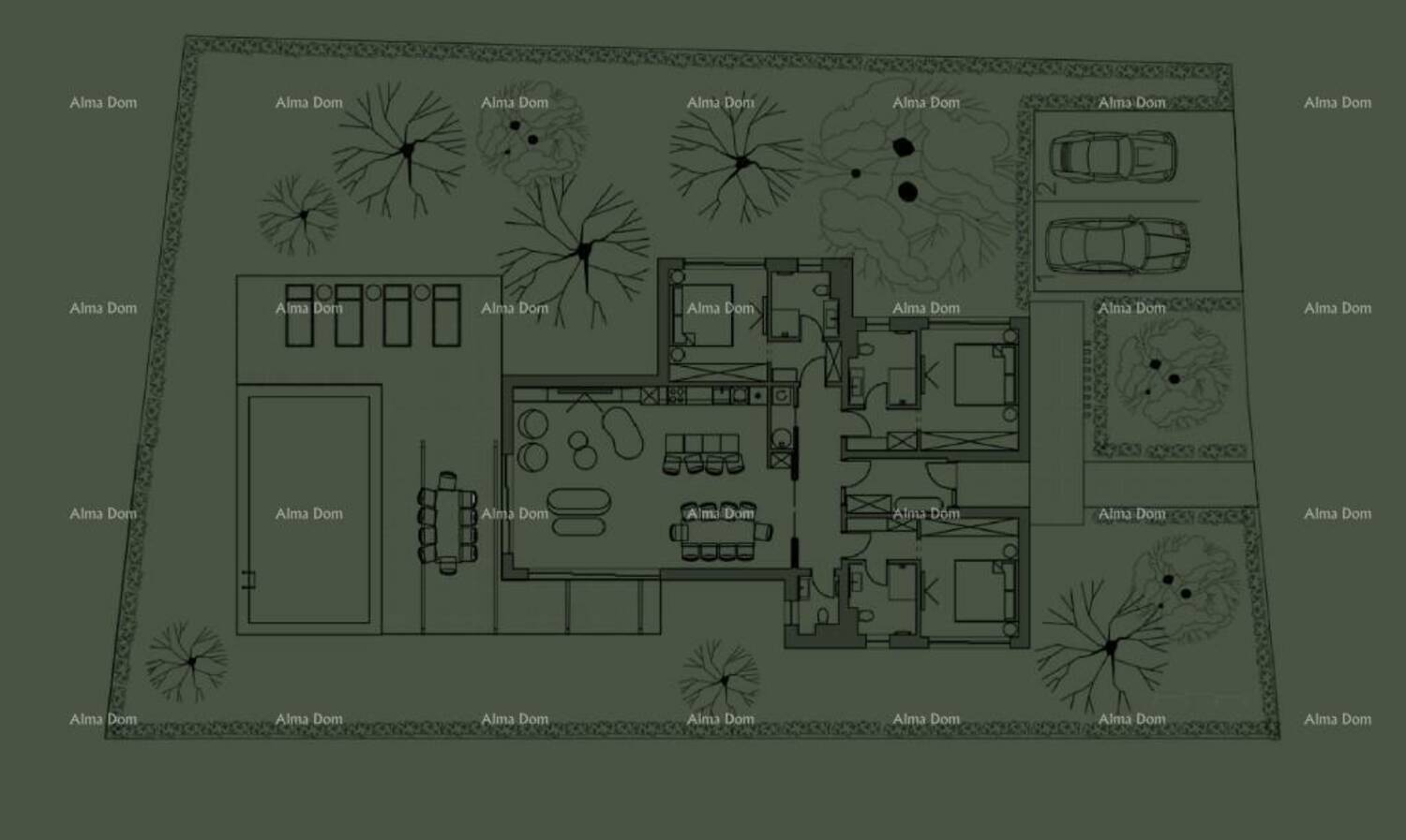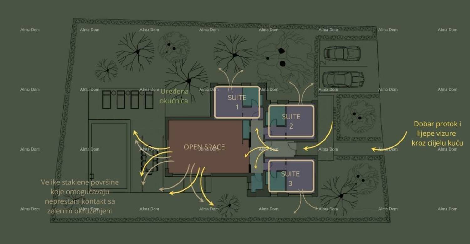 Iz dnevnog boravka se izlazi direktno u vrt na kojem se nalazi terasa, bazen i sunčalište. Na ulaznoj strani, nalaze se dva parkirna mjesta i nadstrešnica od 13,34 m2.