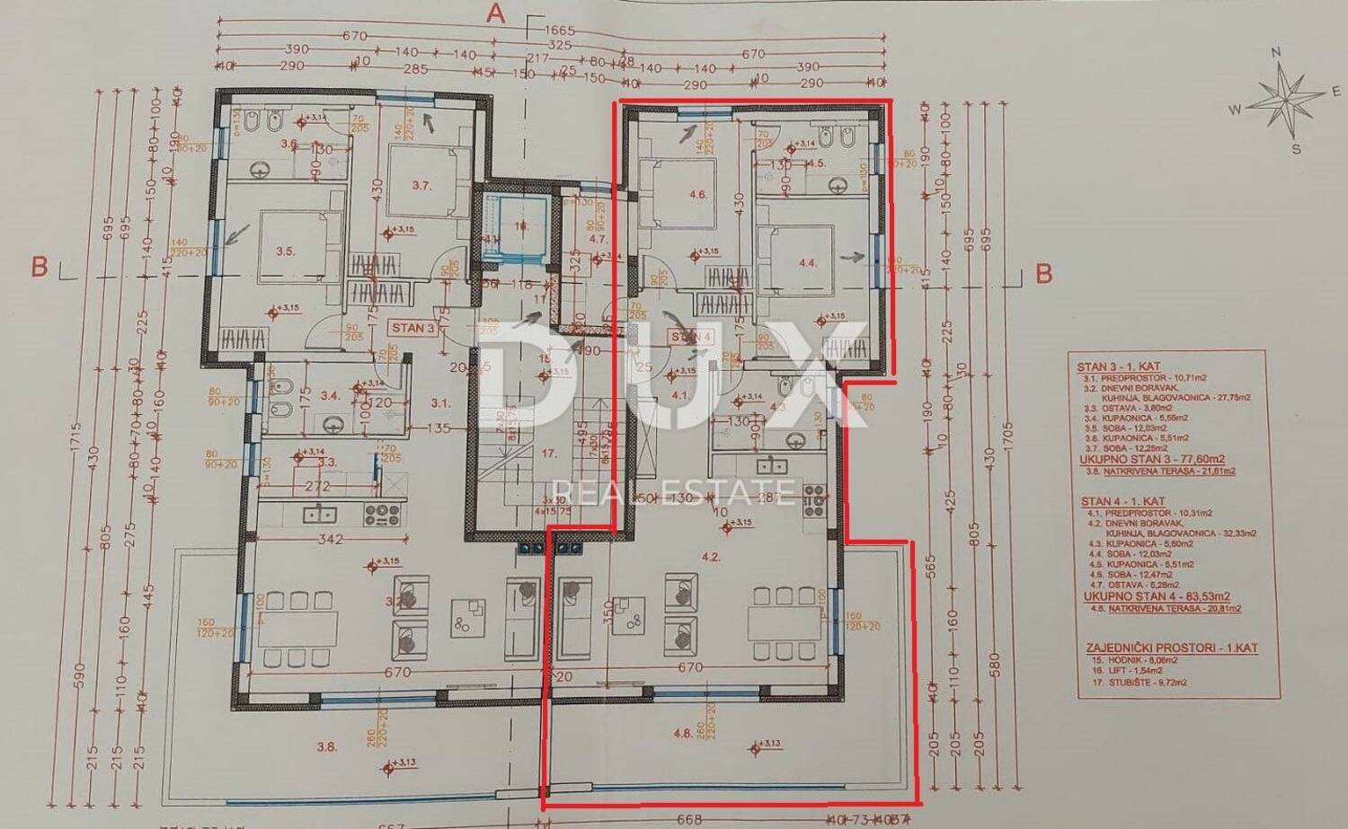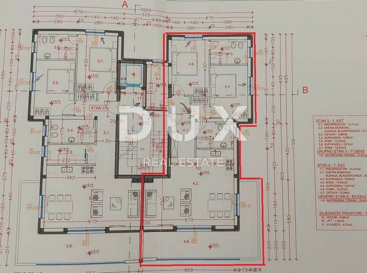 Netto stambena površina stana iznosi: 83,53m2, terase 20,81, spremište (4) 10,80m2, parking.