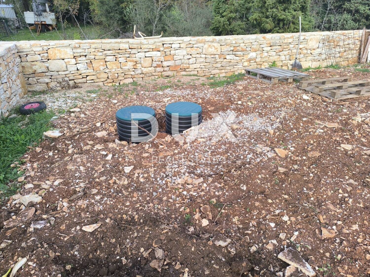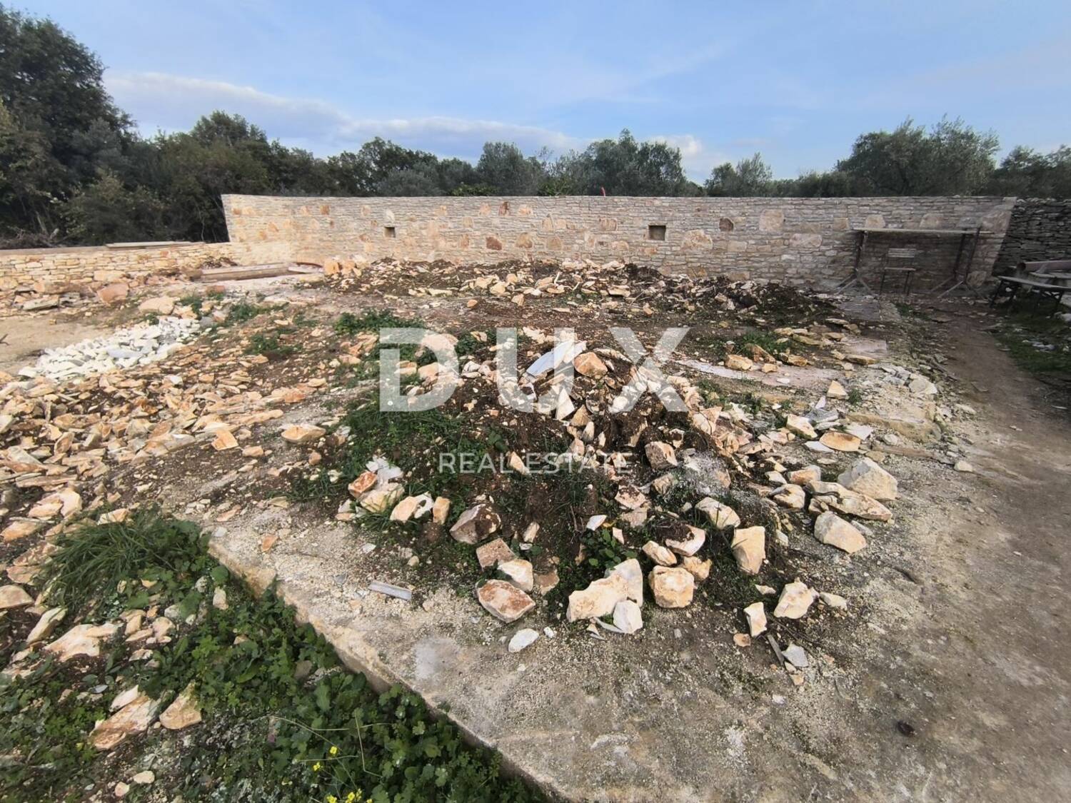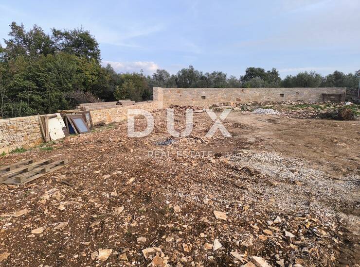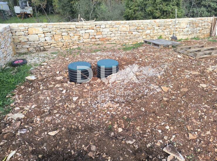 Zemljište je poljoprivredno. Pravokutno, očiščeno, pripojeno uz put. 1,3 km do prvih plaža. Zemljište je ograđeno suhozidom. Na zemljištu se nalazi ruševina koja je uklonjena i ostavljena je samo betonska ploča. Betonska ploča 11 m x 6 m. Kuća je slikana 2011. godine te je vidljiva na orto-foto karti. Na zemljištu bio septička. Priprema za struju i vodu, tuš i vanjski wc. S jedne strane zemljišta legalizirane kuće, s druge strane zemljišta priroda i zelenilo.