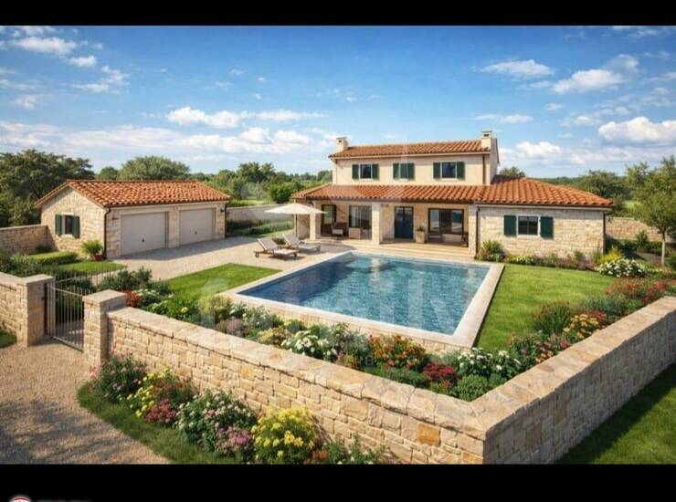 Projekt predviđa suvremeni raspored s prostranim dnevnim dijelom otvorenog koncepta i izravnim izlazom na terasu i bazen.