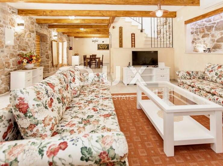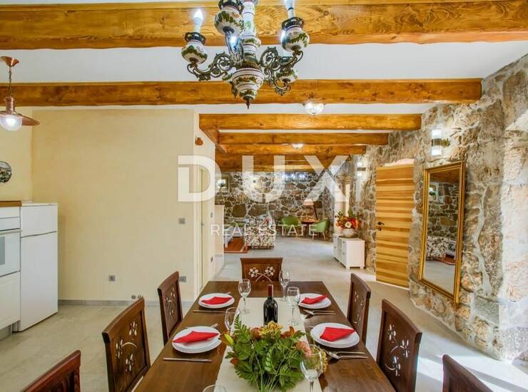 Vila je opremljena prekrasnim namještajem i tradicionalnim kamenim detaljima koji joj daju starinski šarm, a gredama na stropu dodatno se naglašava autentičnost i karakter ovog prostora.