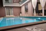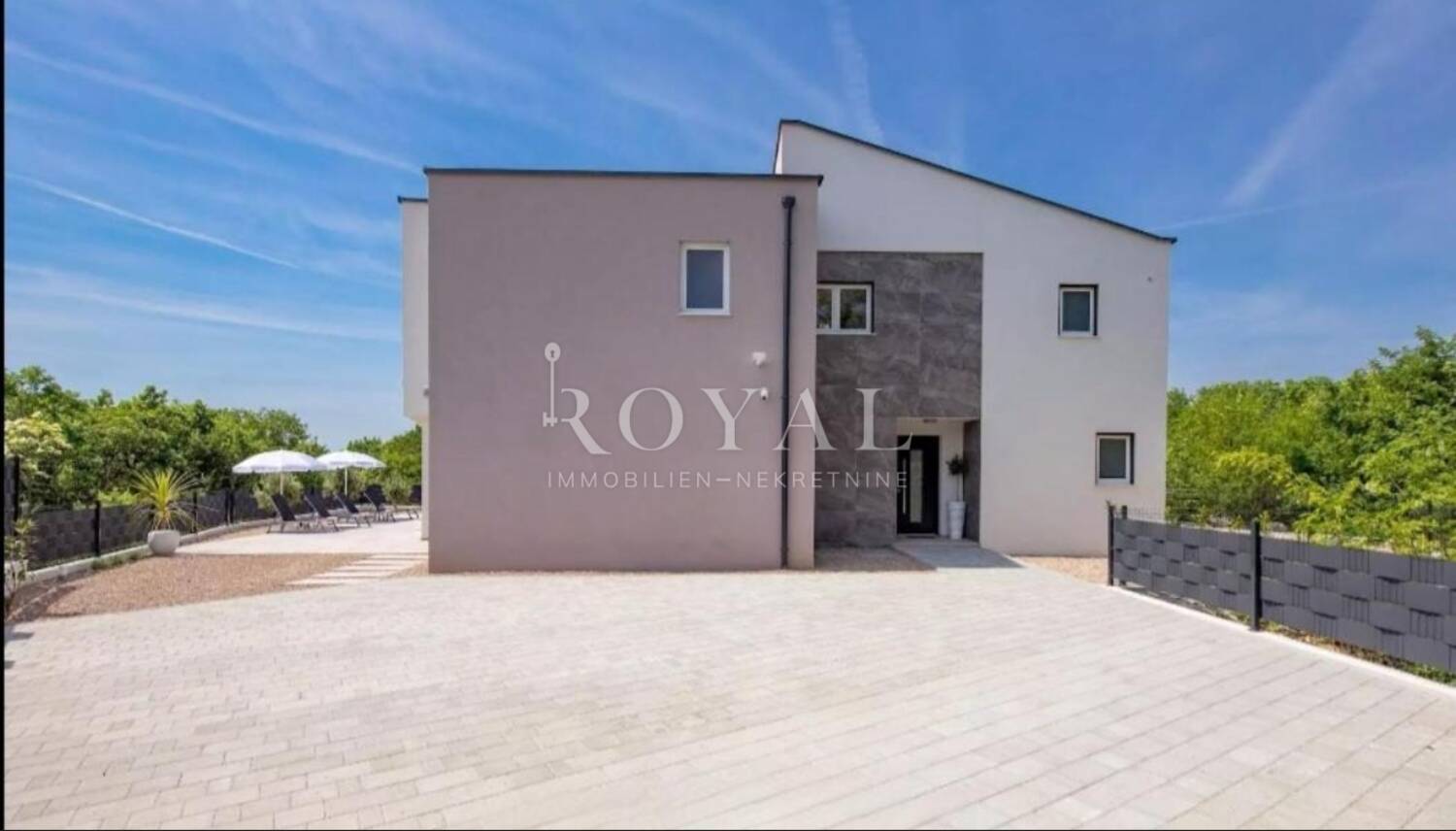 Na okućnici površine 450 m² nalazi se predivan bazen površine 30 m² sa sunčalištem, vanjski tuš, roštilj zona te privatna parkirna mjesta za više vozila. Cjelokupan vanjski prostor dizajniran je za potpunu privatnost, odmor i zabavu.