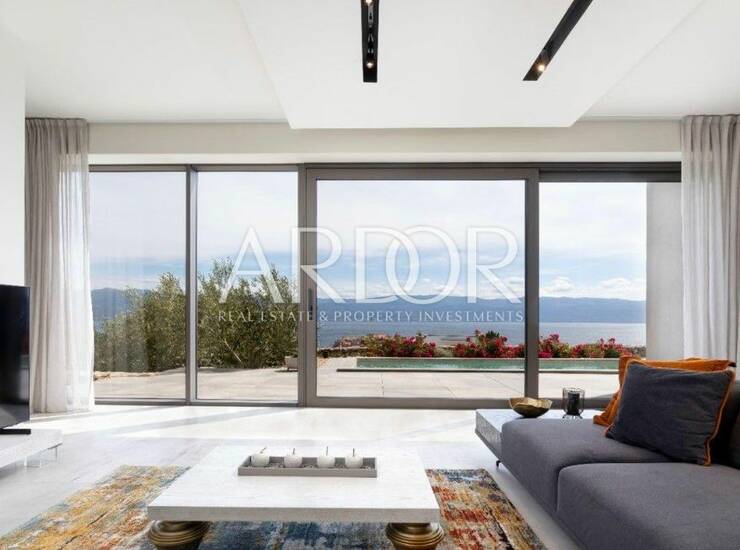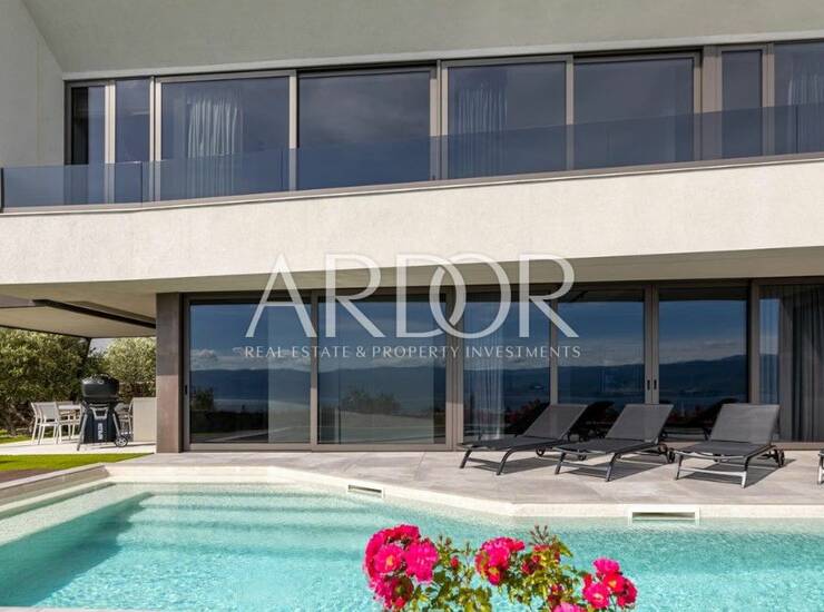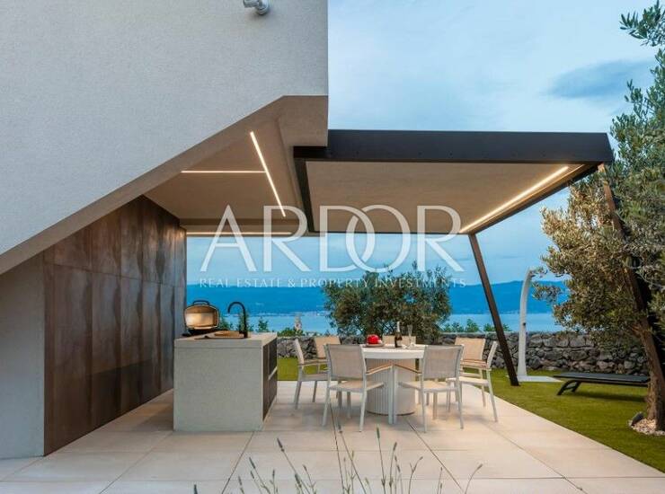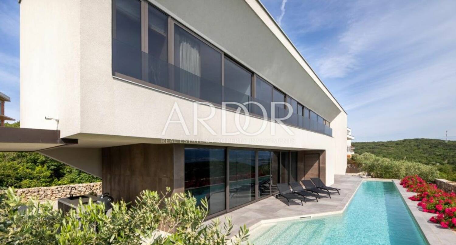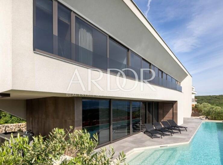 Na poželjnoj lokaciji na otoku Krku, na zemljištu površine gotovo 1000 m², smjestila se moderna vila koja svojim dizajnom pruža vrhunski komfor i neometan pogled na more.