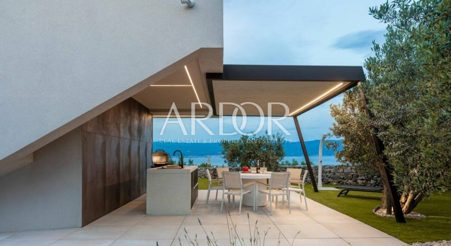 Vanjski prostor nudi sve što je potrebno za uživanje tijekom cijele godine: natkriveni prostor za blagovanje na otvorenom, ljetnu kuhinju s roštiljem, tuš na otvorenom te pomno osmišljen mediteranski vrt koji osigurava mir i intimu.