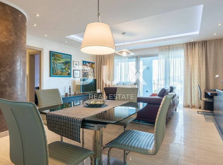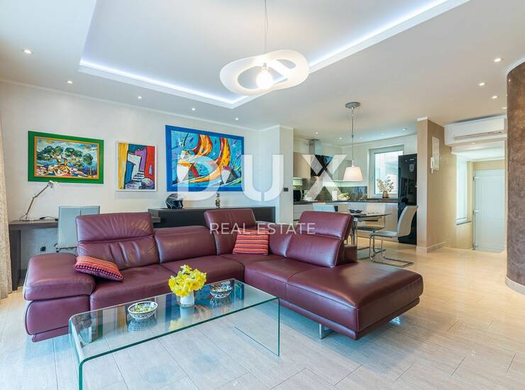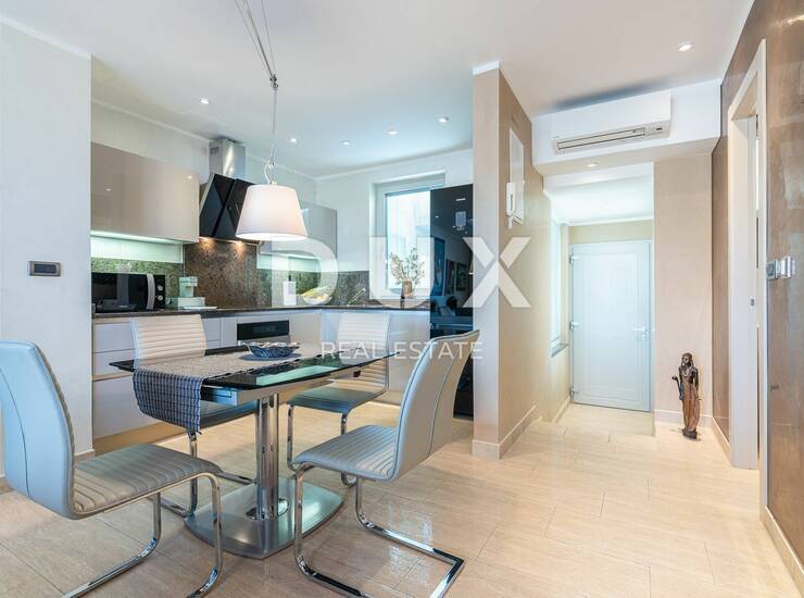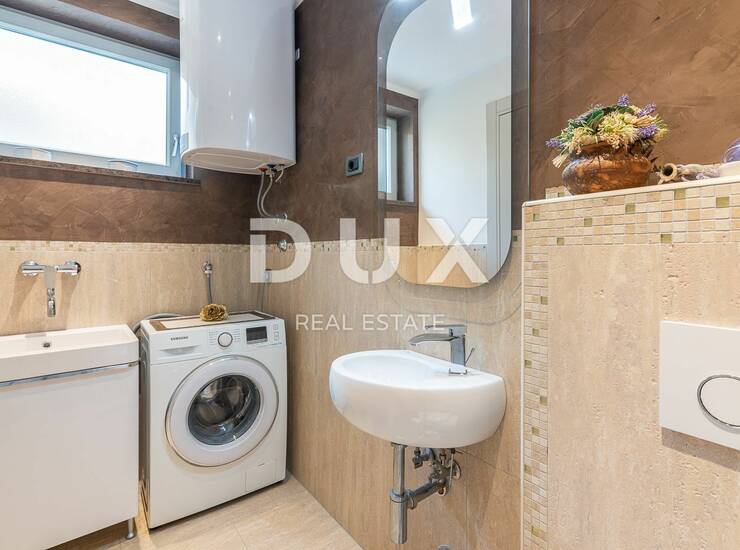 Na oko 700 metara od mora u prizemlju stambene zgrade smjestio se ovaj lijepi, moderan trosoban stan. Ima oko 106 m2,a sastoji se od kupaonice, WC-a, ostave, spavaće sobe, radne sobe, garderobe, kuhinje, blagovaonice, dnevnog boravka i lijepe, velike loggie s koje se pruža predivan pogled na more i grad Vrbnik. Stanu pripada drvarnica, okućnica od oko 40 m2 i jedno parkirno mjesto. Stan je renoviran i u njega su ugrađeni vrhunski materijali, postavljeno je podno grijanje, a hlađenje je riješeno klima uređajima. Stan se prodaje u potpunosti namješten.