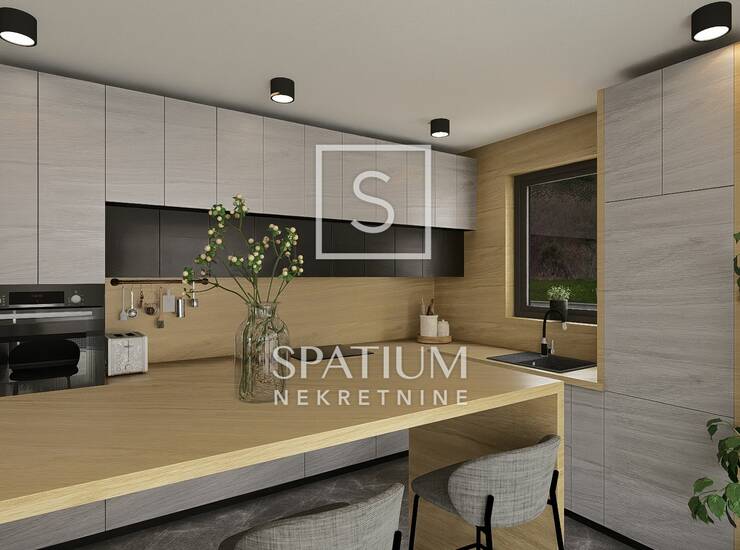 Stan ima stambenu površinu od 90,87 m², sastoji se od tri spavaće sobe, dvije kupaonice, dodatnog WC-a, te dnevnog boravka s kuhinjom i blagovaonicom koji imaju izlaz na natkrivenu terasu površine 13 m². Stanu pripada dvorište s bazenom površine 24 m² i dva vanjska parkirna mjesta. Ukupna neto površina iznosi 107,41 m².