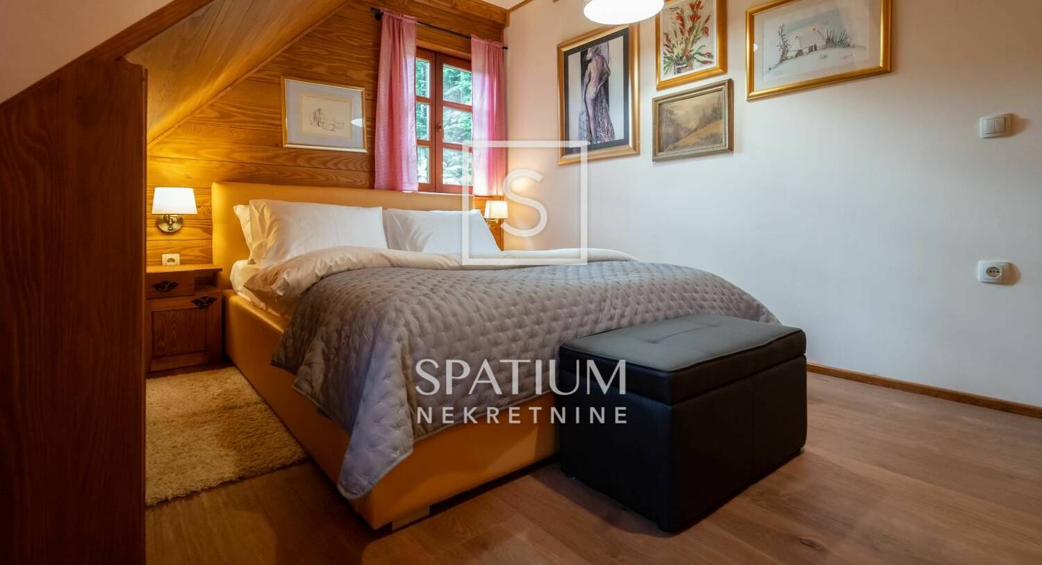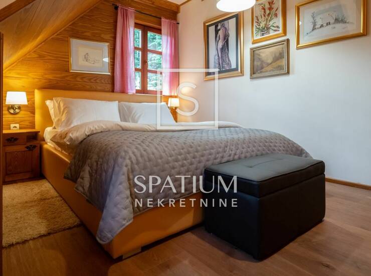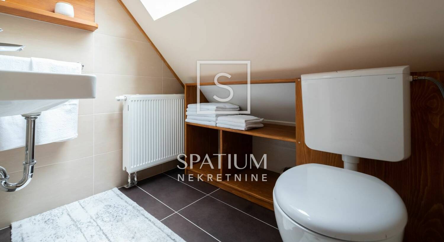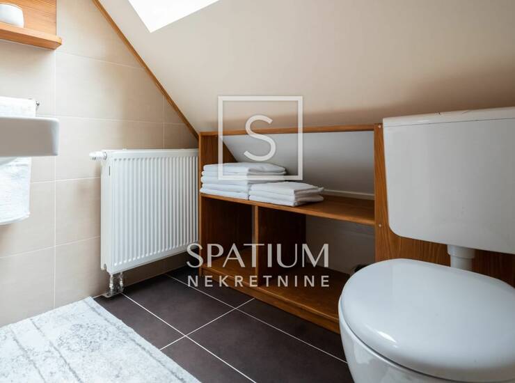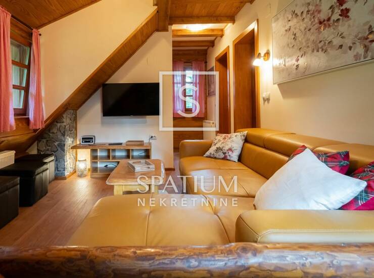 Sastoji se od prizemlja i visokog potkrovlja. U prizemlju nalazimo kuhinju s blagovaonicom i kupaonicu te natkrivenu terasu sa zidanim roštiljem. U visokom potkrovlju se nalazi dnevni boravak, dvije spavaće sobe i dodatni toalet. U sklopu kuće, nalazi se i spa zona sa saunom i hidromasažnim bazenom.