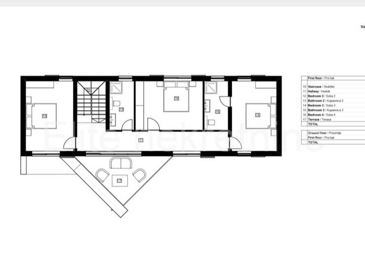 Na katu vile nalaze se tri spavaće sobe, od kojih svaka ima vlastitu kupaonicu, čime je osigurana privatnost svih članova obitelji. Iz jedne od spavaćih soba izlazi se na terasu od 12 m², s koje se pruža prekrasan pogled na okolnu prirodu i mirnu okolinu. Dodatni sadržaji poput pergole površine 30 m² i bazena čine ovu vilu savršenim mjestom za opuštanje i uživanje u toplim ljetnim danima.