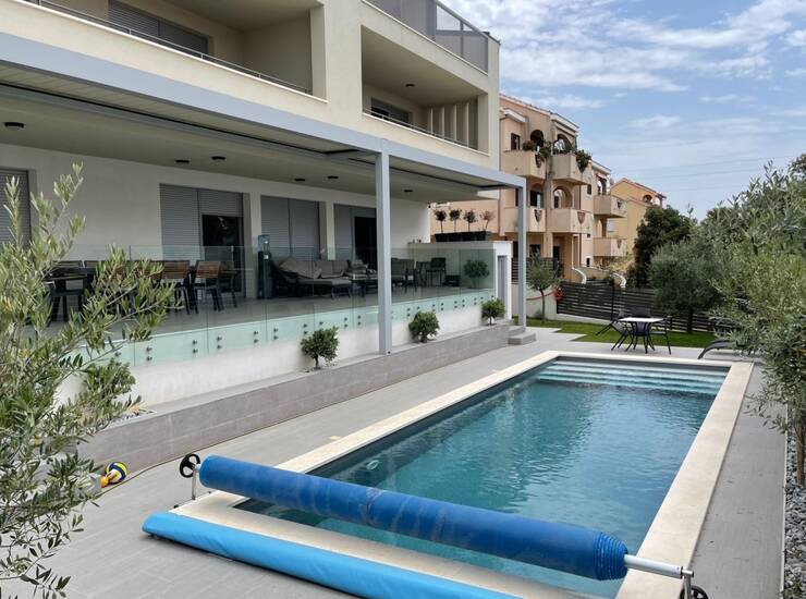 U prizemlju vile nalazi se potpuno opremljen i luksuzno uređen stan s dvije spavaće sobe, te open space dnevni boravak, kuhinja i blagavaona. Luksuzni dizajn vile uređene po najnovijim standardima i opremljene najboljim markama za uređenje interijera impresionira svojom minimalističkom jednostavnošću. U prizemlju se nalazi i prostrana terasa s vrtom opremljenim automatskim navodnjavanjem travnjaka i velikim grijanim bazenom veličine 40 m2. Na prvom i drugom katu nalaze se dva potpuno uređena apartmana s prekrasnim pogledom na more. Vila raspolaže i s velikim podrumom veličine 116 m2. Vila ima na raspolaganju osam parkirnih mjesta.