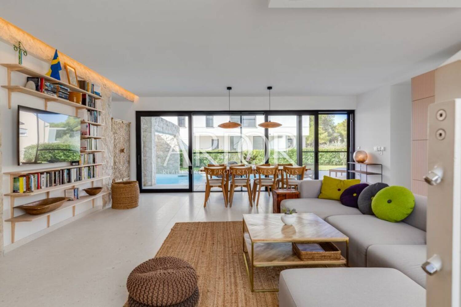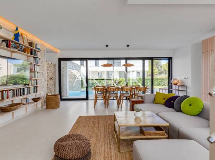 Dnevni boravak otvorenog koncepta povezan je s privatnim vrtom i terasom, sa svega nekoliko koraka do bazena. Budući da je boravak na otvorenom u fokusu mediteranskog načina života, vanjski dio sastoji se od natkrivenih i nenatkrivenih terasa, sunčališta, vanjskog tuša, blagovaonskog stola za osam osoba te potpuno opremljenom vanjskom kuhinjom s električnim roštiljem.