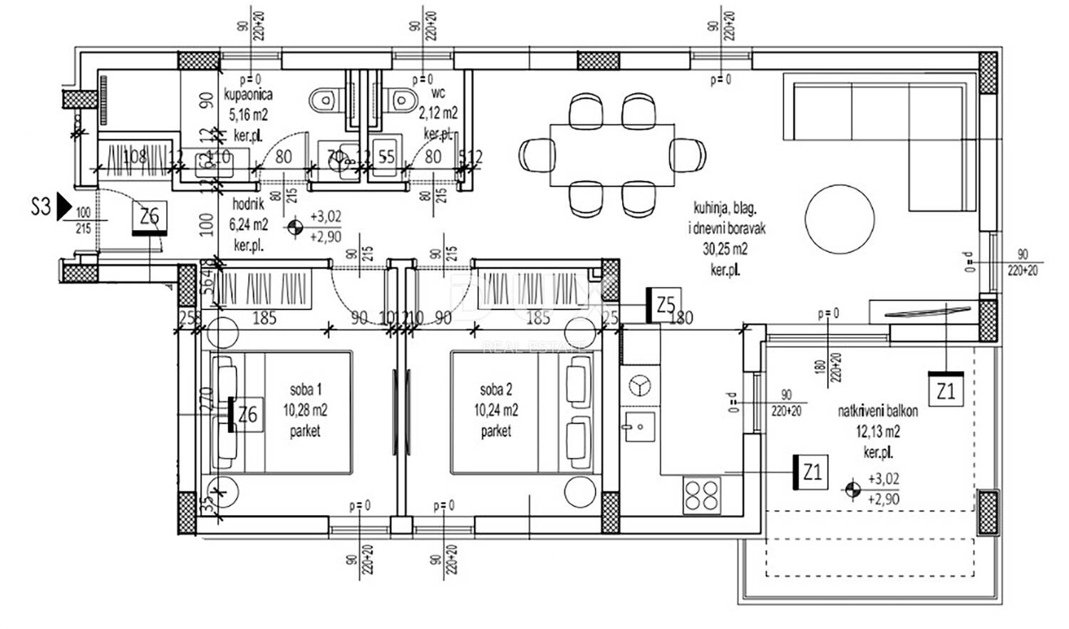Stan S3 nalazi se na 1. katu na jugoistočnom dijelu zgrade, a sastoji se od:
