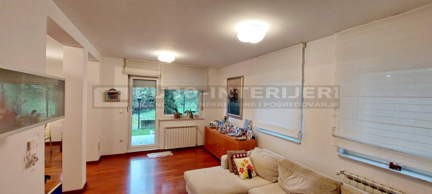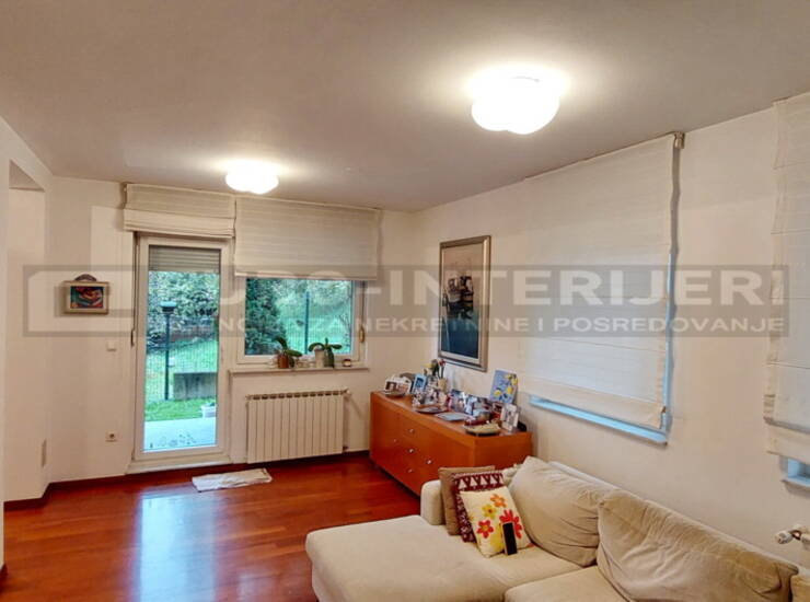 Iz dnevnog boravka je izlaz na natkrivenu terasu te ograđen vrt od cca 90 m2.