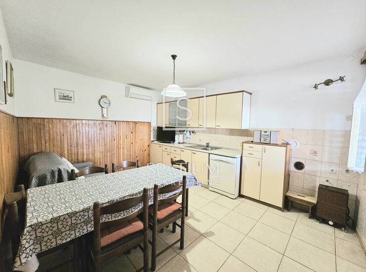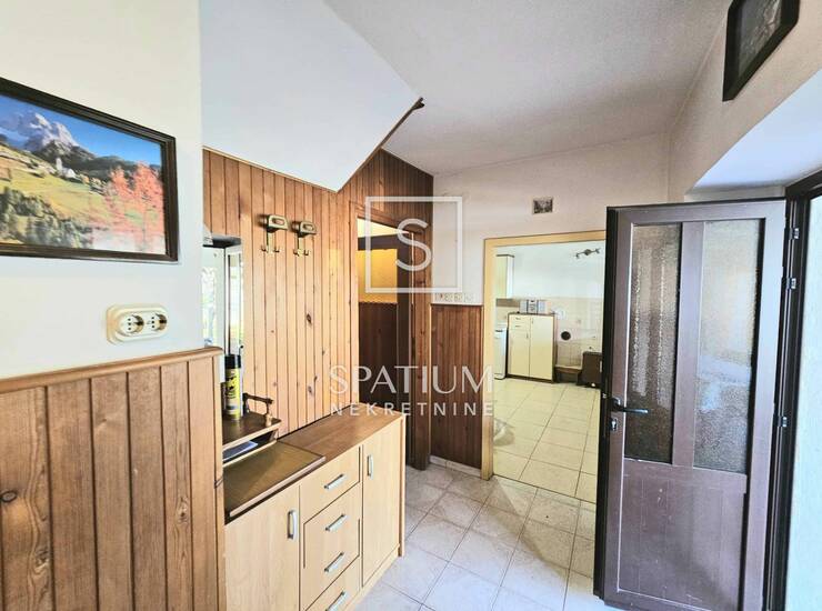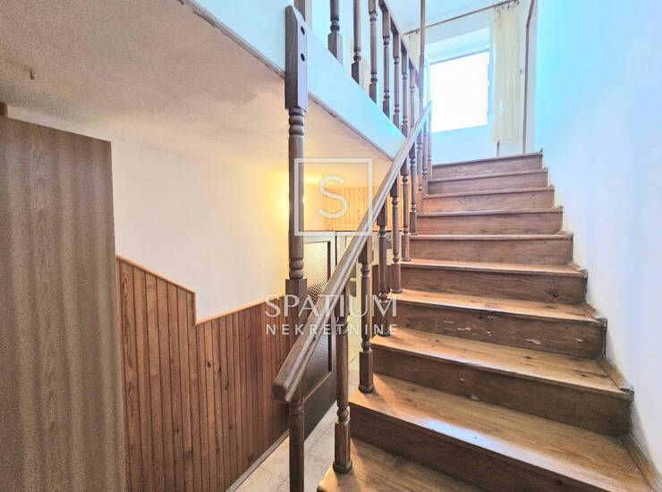 U prizemlju kuće su smješteni kuhinja, dnevni boravak, kupaonica a ulazni hodnik sa stepeništem vodi na kat.