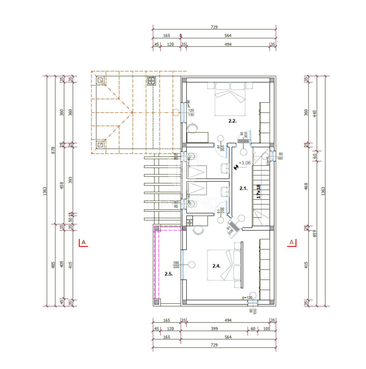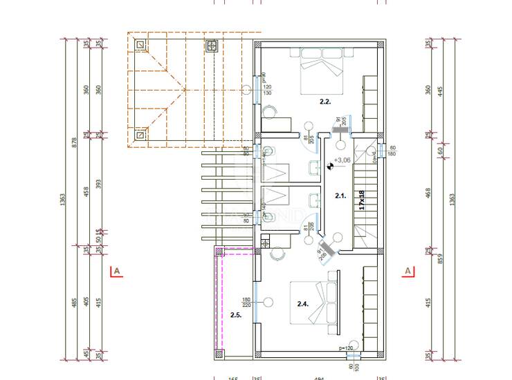 Stepenište, skladno uklopljeno u dnevni dio, vodi na kat gdje su smještene dvije spavaće sobe, svaka s vlast