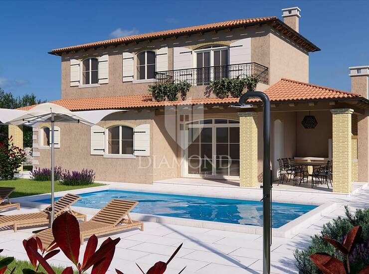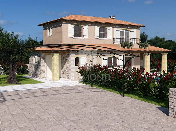 Kuća se gradi u tipičnom istarskom stilu, s naglaskom na materijale i detalje koji joj daju toplinu i trajnost: drveno krovište, izolacija kamenom vunom, istarska kupa i fasada u kombinaciji s kamenom. Planirana je ugodna cjelogodišnja funkcionalnost – podno grijanje u prizemlju i na katu te klimatizacija u svakoj sobi i dnevnom prostoru. Interijer je zamišljen vrlo praktično: predvorje, dvije spavaće sobe, dvije kupaonice i dodatni WC, kuhinja s blagovaonicom i dnevnim boravkom, kuhinjska ostava, strojarnica bazena, kotlovnica s vešerajem te dodatno spremište predviđeno za potrebe održavanja okućnice. Posebna vrijednost je i vanjska ljetna kuhinja s kaminom – mjesto koje kući daje onaj pravi istarski “gušt” i produžuje sezonu druženja.
