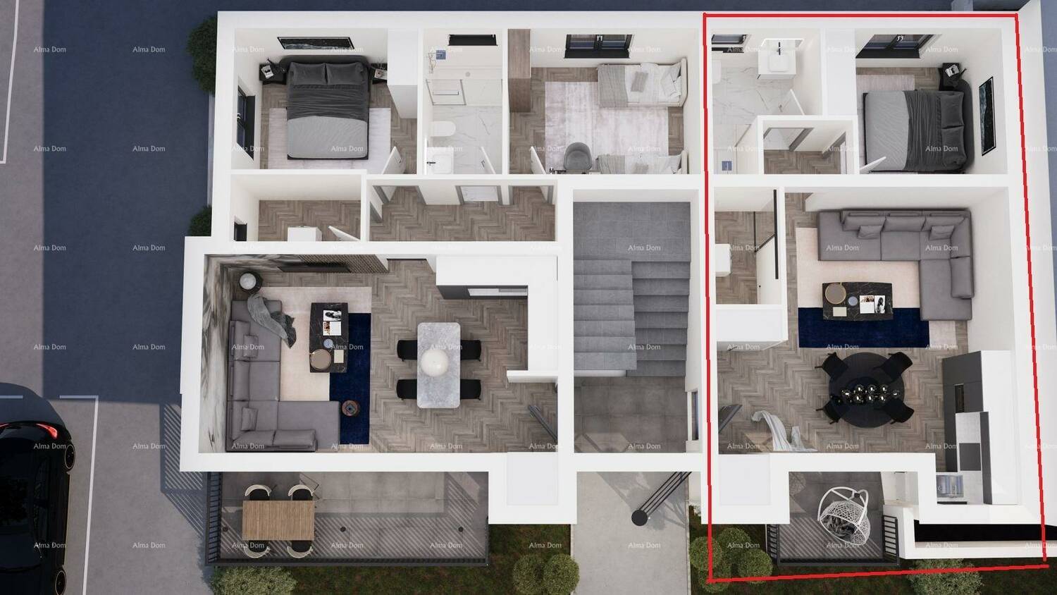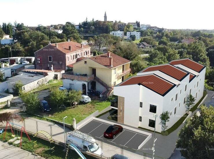 Apartman se nalazi u novoizgrađenoj stambenoj zgradi u mirnom dijelu slikovitog istarskog gradića Žminja. Ovaj grad je poznat po mirnom tempu života, tradicionalnoj arhitekturi i povoljnoj lokaciji - tu su supermarketi, ljekarna, škola, vrtić, pošta, restorani i sve što je potrebno za svakodnevnu udobnost.