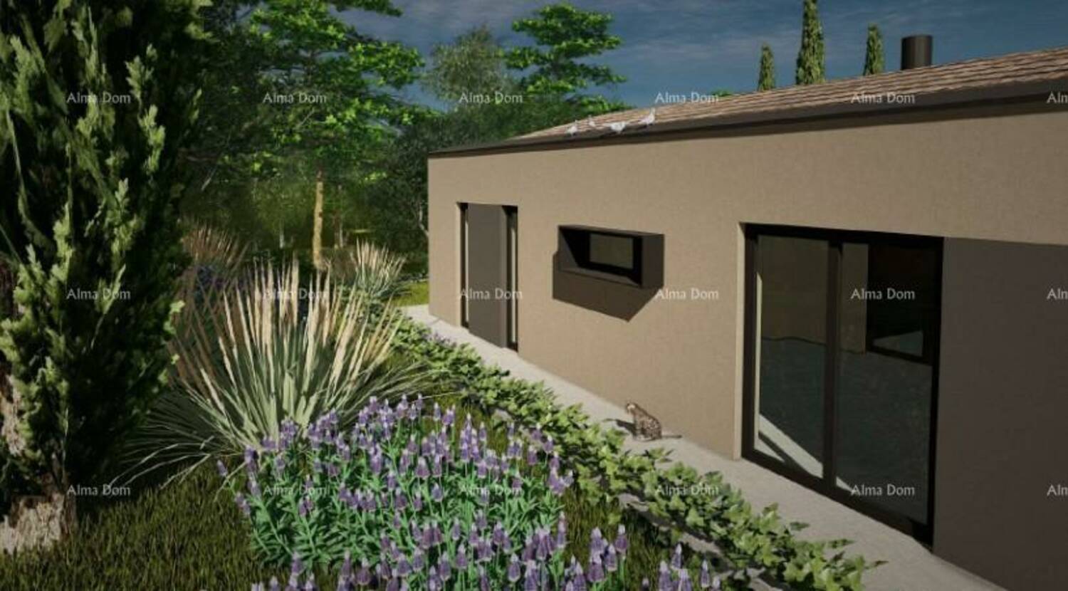 Prizemlje: otvoreni koncept dnevnog boravka, kuhinje i blagovaonice, gospodarska prostorija s toaletom te spavaća soba s vlastitom kupaonicom. Iz dnevnog dijela izlazi se na natkrivenu terasu i bazen.