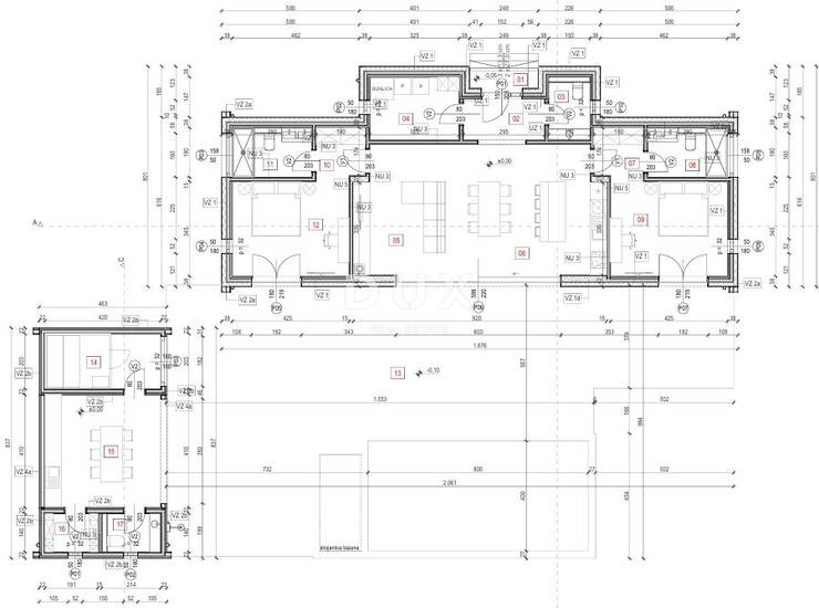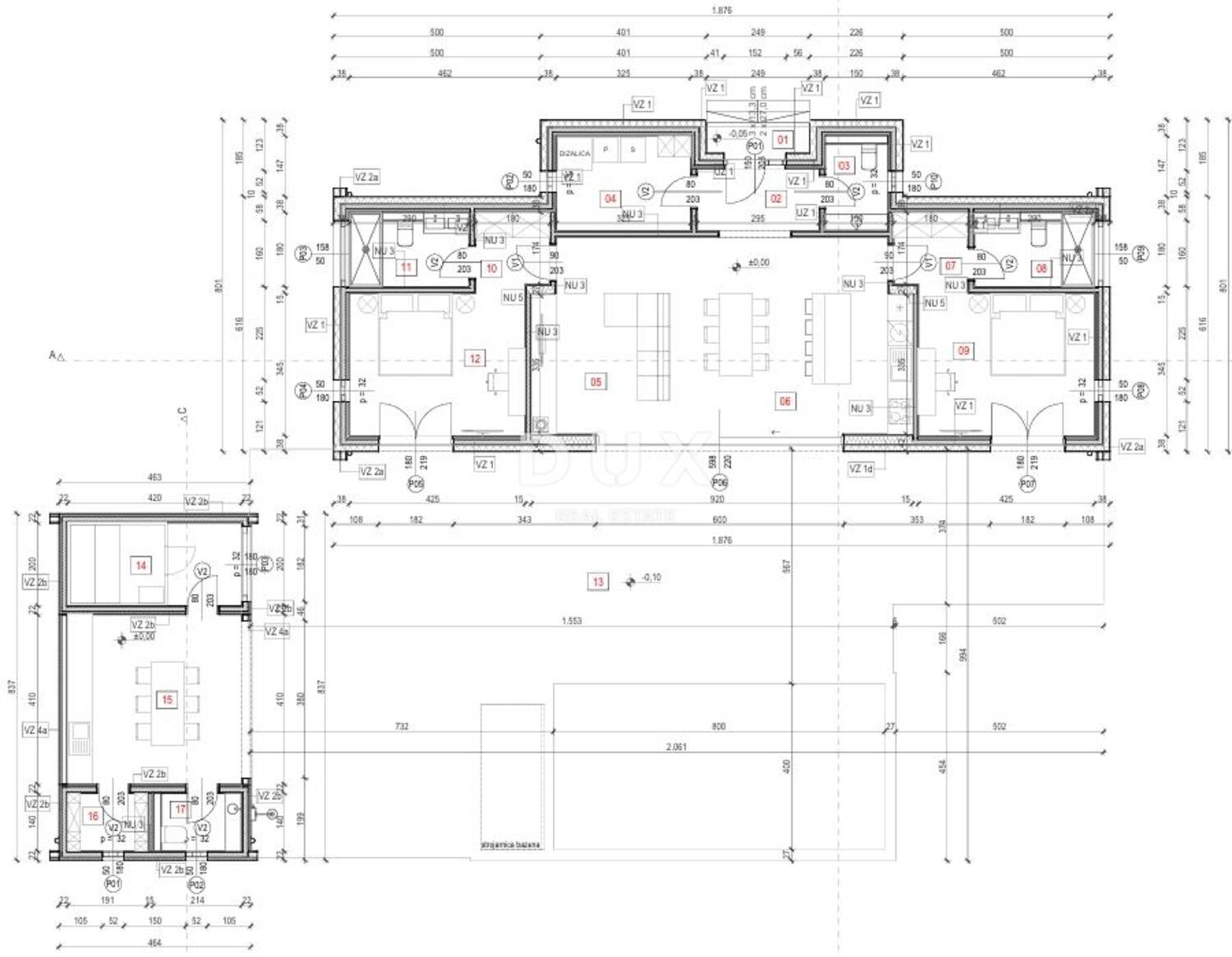 Jedna od građevinskih parcela dolazi s već izrađenim projektom i izdanom pravomoćnom građevinskom dozvolom za montažnu kuću modernog dizajna, s pomoćnim objektom koji uključuje ljetnu kuhinju, saunu i vanjski bazen ukupne neto korisne površine 275,64 m².